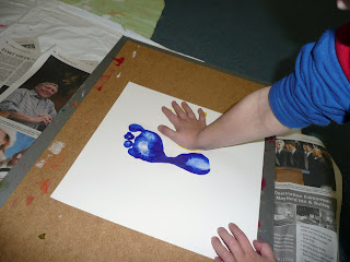 Set up your workspace. We worked on the ground, I set up my dropcloths which are just vinyl tablecloths (they work like a charm). Place out a chair for the child to sit on. Remove one shoe and sock. Pour some blue tempera into a foam plate, double it for extra strength. Press foot into paint.