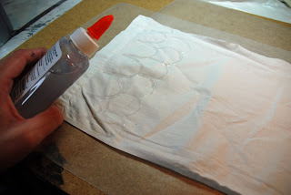 Draw on with glue a scale design for your dragon skin. Follow the directions from my blue glue batik tutorial if you are not familiar with this technique.