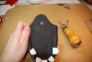 Make a hole in the back piece thru the lump you made, again don't go all the way thru just enough to hold the stick in place.