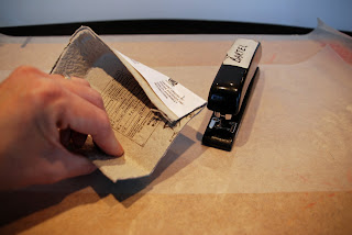 On the underside make a lump of mache at the end close to where you stapled this piece. Again this will give you a place to attach your stick later.