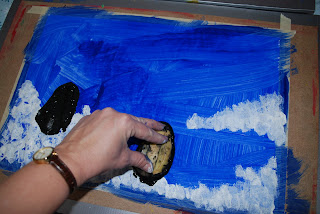 Paint your page completely with the blue paint. We used large brushes. Lee Valley has a brush set that is inexpensive and works great for as a school set.