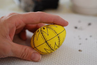 We are going to divide the egg off for the design. We will use pencil for a guideline. The pencil marks will wipe off at the end...use fine lines and don't use a eraser if you make a mistake, it will leave a residue that will resist the dye...just leave it.