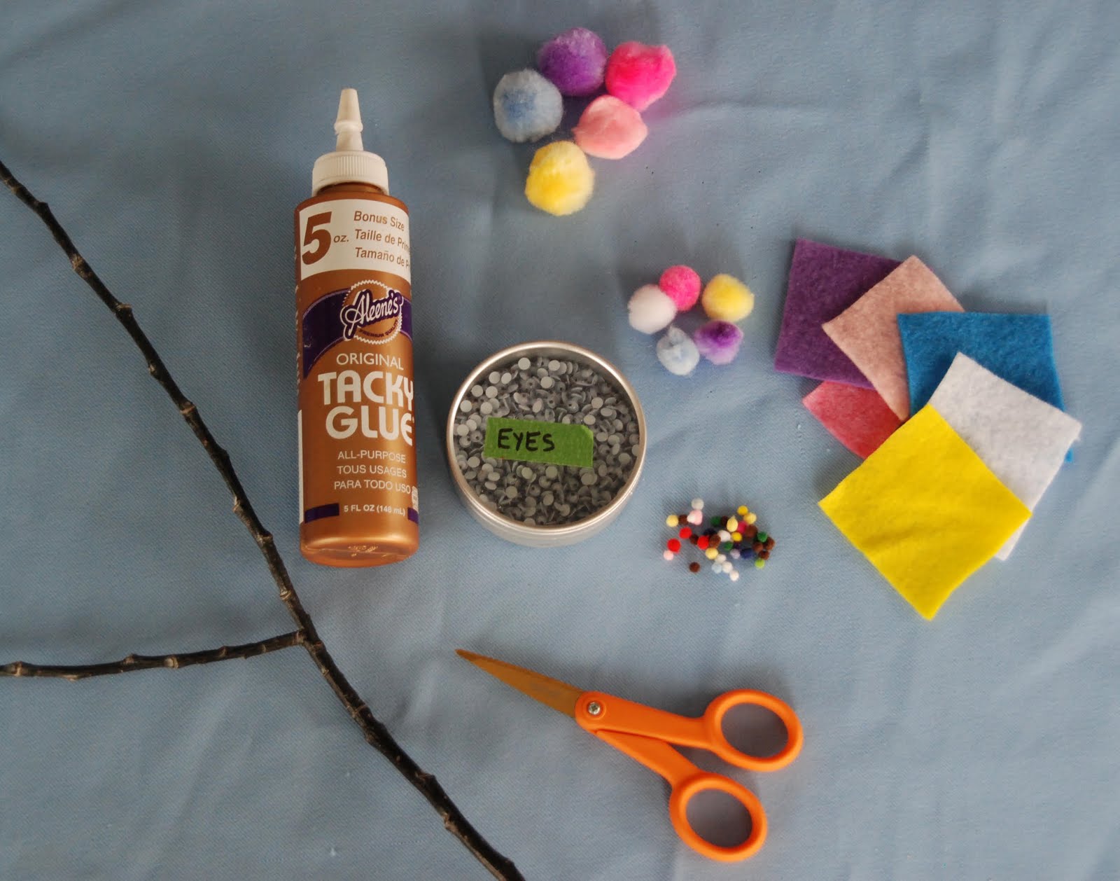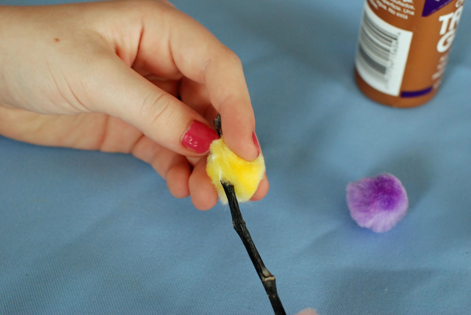 Find a good spot on your branch...stick the pompom on and give it a good squeeze.