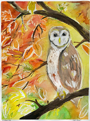Add extra color where needed...maybe some veining in the leaves with some contrasting fall colors...a little dark brown on the Owl's wing feathers. Add the eyes and you're done!