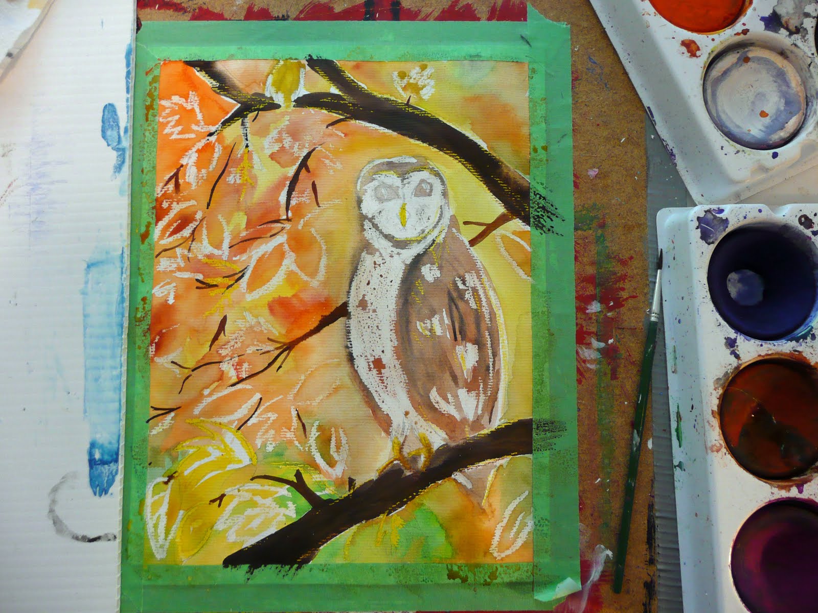 Paint the Owl brown.... the pastel will resist the paint highlighting the features you have marked.