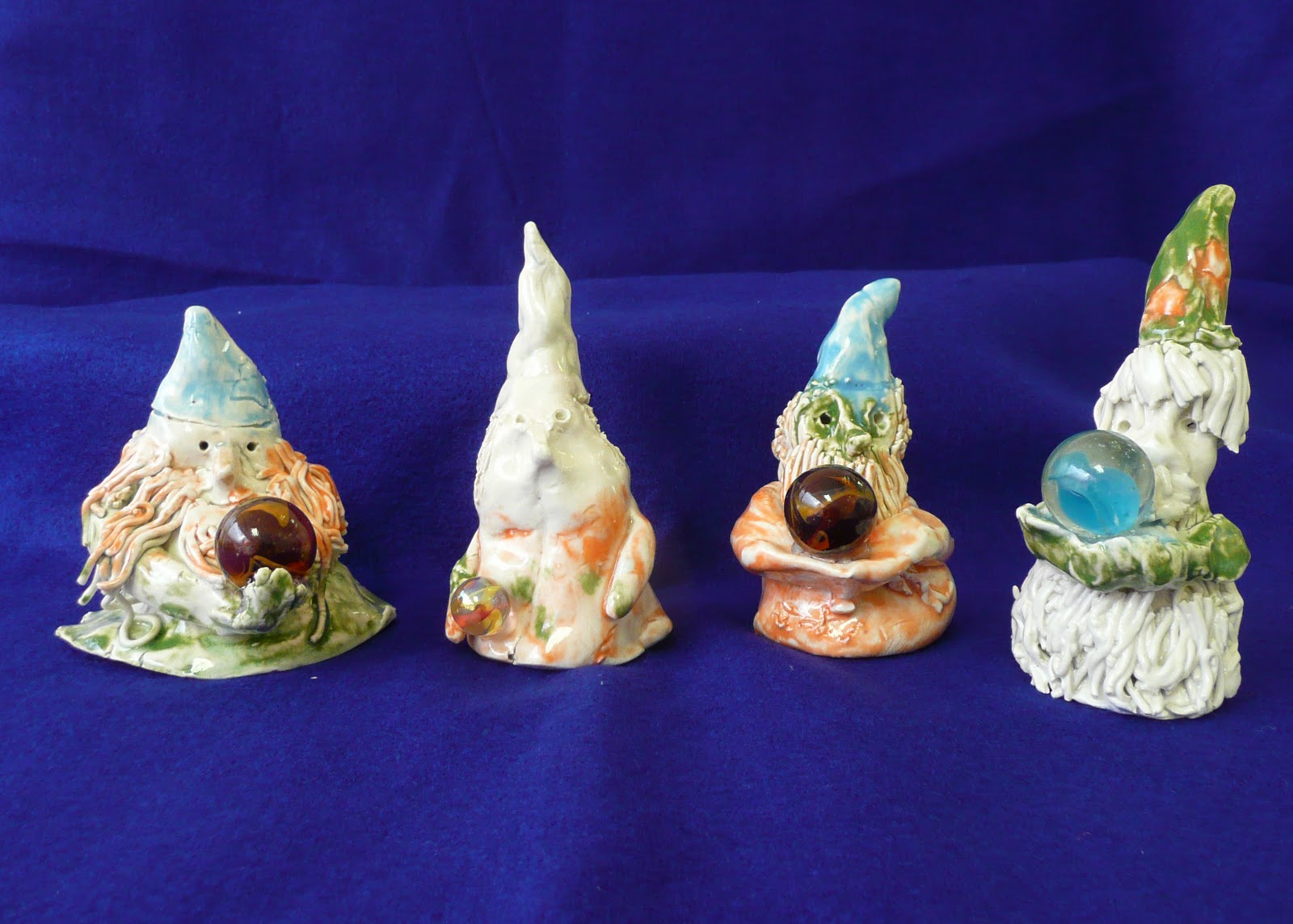 They were then glaze fired (cone 6) and I glued a marble in place with the hot glue gun.
