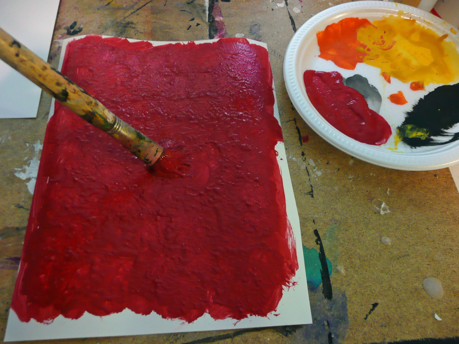 While your background is drying work on your poppy papers. You want a few types. In this one I'm using thicker liquid tempera and patting it in with the brush leaving some nice textured brush marks.