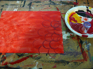 In this one I painted the paper a background red, left it to dry and then came in with a different color red and stamped in circles using a small plastic cup.