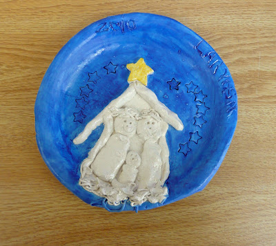And here is the Nativity plates that Kindergarten did this year. I changed the color concept a bit using a blue wash, yellow metallic for the star, and sparkle varnish on the Nativity scene.