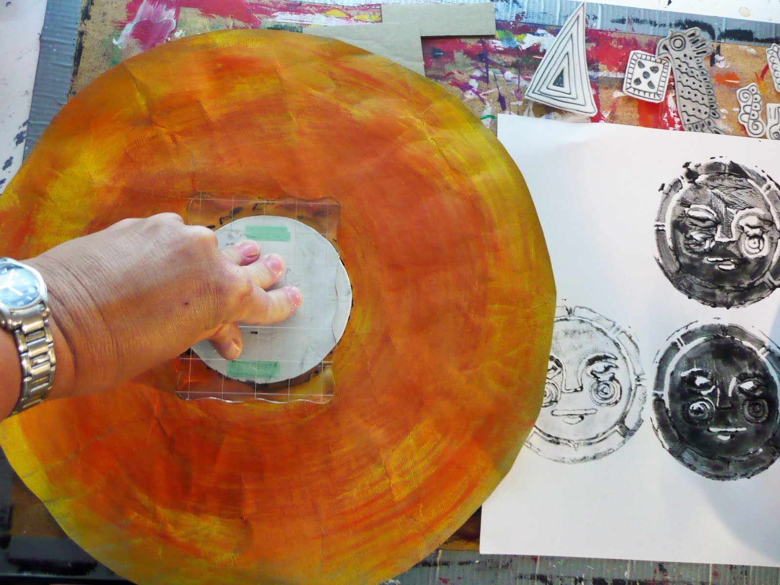 We are going to use a neat printmaking technique to achieve a nice old worn look to our "paper" sun stones.