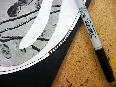 After paint is dried come in with some pastel or colored pencil to add a few details. As you can see we did it before the handprints but found we had to come back in again to add some to the wings so do it after.