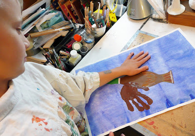 Dip hand in to paint and then make print on the paper.