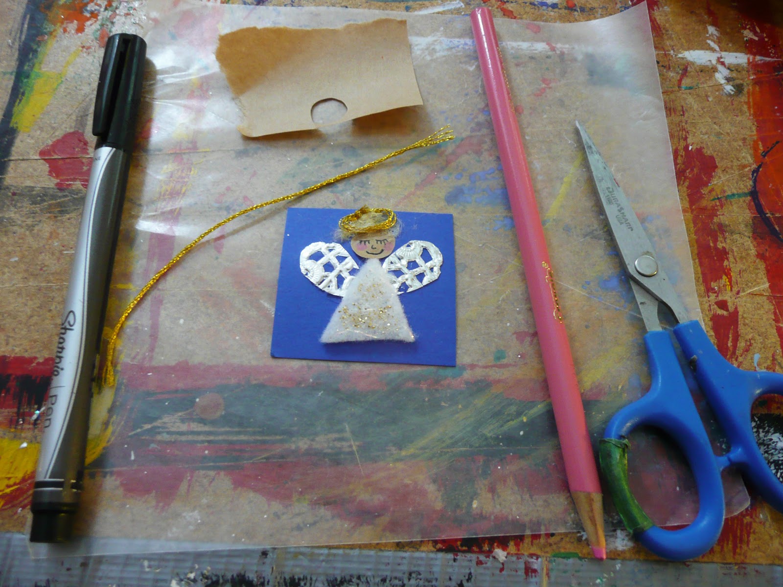 I trimmed it with a small piece of felt, added a loop with the blue sharpie and painted on a little glitter.