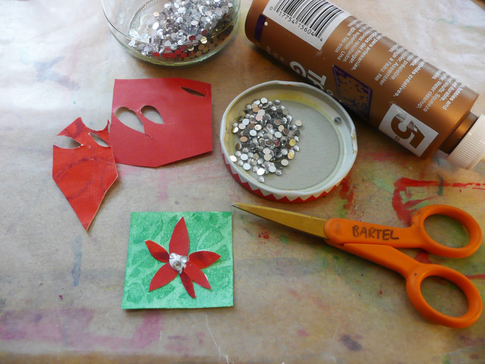 - then paint 3 squares, green , red and white glitter