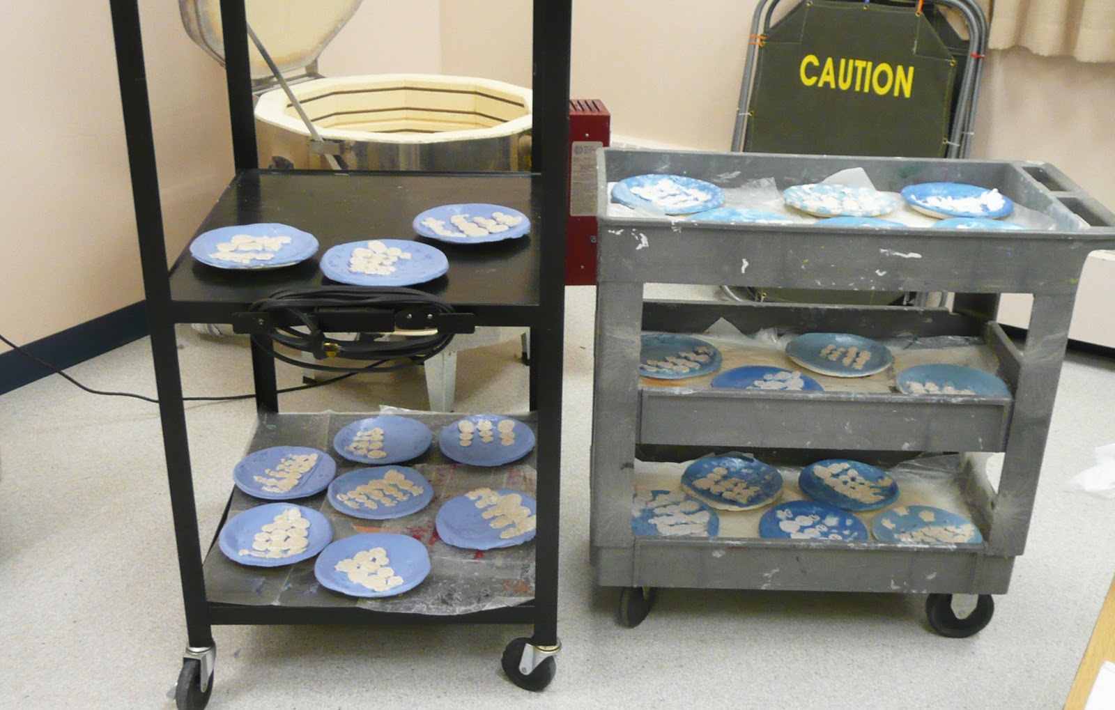 Last week the kiln began having thermostat problems....big headache!, but we were able to rescue our projects. Luckily all the bisque fires had been done.