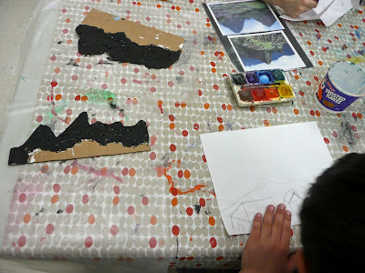 Hand out extra pieces of corrugated cardboard.  Have the kids line up a corner of the cardboard with the canvas.  Trace out a mountain ridge in pencil and then cut out of cardboard.