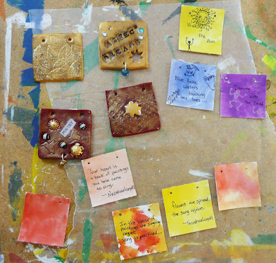 stepping stones, and Amate paper cut outs. My co instructor Min, had them learning about Aztec history and culture, doing a bit of drama, writing poetry, and drumming. At the end of the 3 day workshop they each presented a poem accompanied by the drums of their classmates in front of a live audience. It was terrific!
