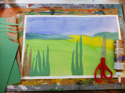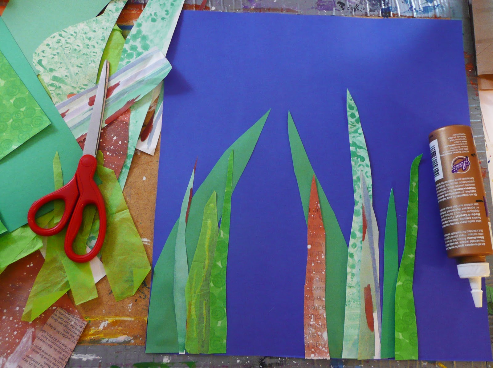 Another background option is posterboard. Here I'm using blue posterboard and then taking a variety of painted papers, scrapbooking papers, and whatever was in my stash I cut reed shapes and glued them down.