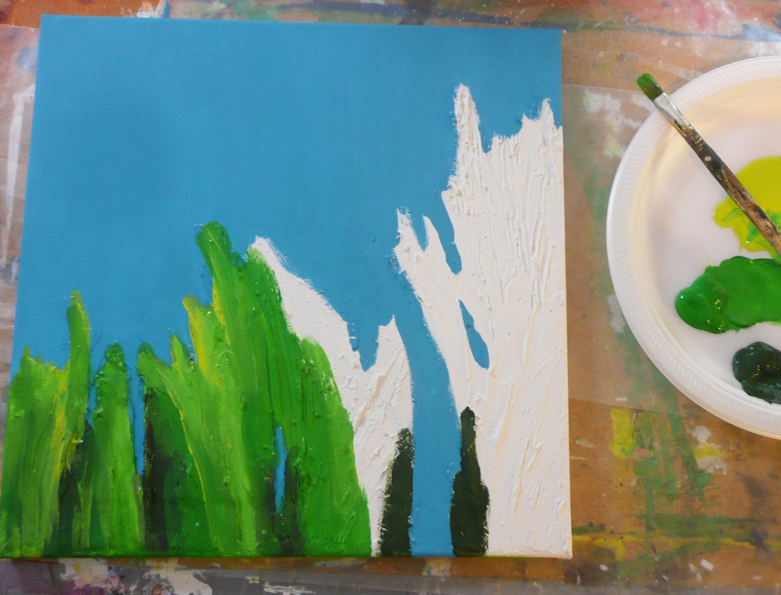 Once the drywall is dry paint your background/substrate with acrylic or tempera paint. Start with the sky as it is furthest back, then the reeds.