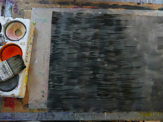 Paint your heavy sketch paper grey, Just swirl a little black onto your white tempera disk. Use short sideways strokes with a large paintbrush. I buy a class set of those cheapo ($1.00-$2.00) brushes at the hardware store. They are meant for one time only use (applying sealer), but I keep them for years.