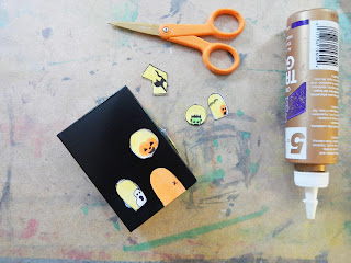 Put some glue on the bottom of the box and place into position on the cardboard base you painted.