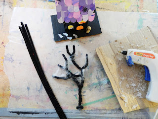 I made a tree by twisting 2 pipe cleaners together. I took a third one and cut it in pieces and twisted them on for extra branches. I added a little spider webbing and 2 plastic spiders.