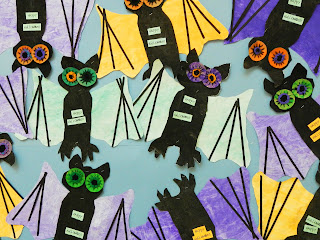 Before I go I just want to show you this year's version of the Woven Bat project. I changed it a bit. We made the wings from paper we painted and then added some plastic wrap on top before it dried. We smooshed it and left it on to form wrinkles. (More details on this technique in this post).