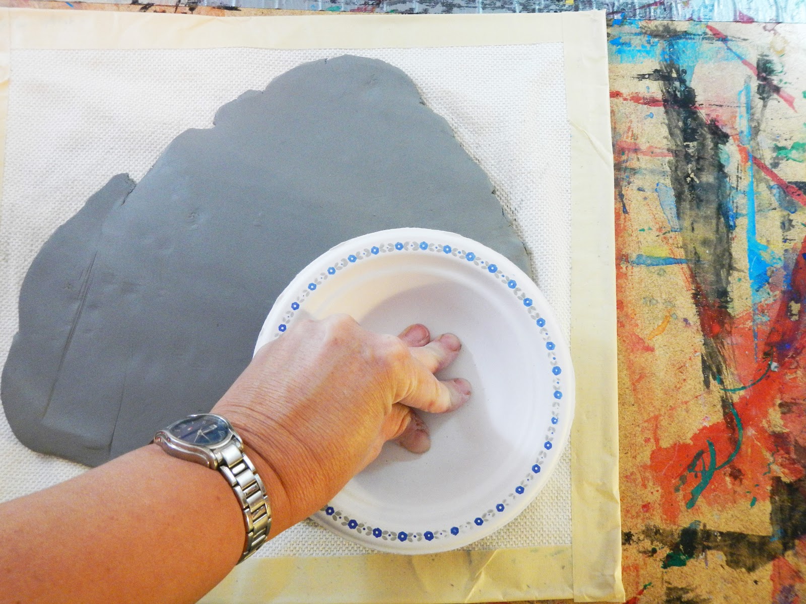 It will leave an imprint so you can cut your base the right size. I use this opportunity to discuss with the kids how you don't want to do this in the center of the slab as you want to ensure you have plenty of room to cut your petals.