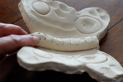 To 'glue' clay to clay I make little scratches on the 2 surfaces.