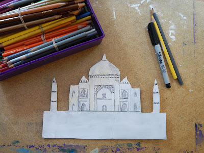 When the paint has dried on your cardboard Taj Mahal you can add details with a fine sharpie, shading with a grey pencil crayon and highlights with a yellow pencil crayon.