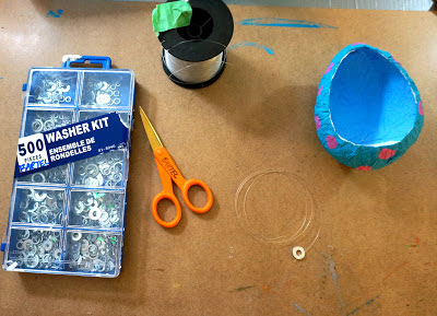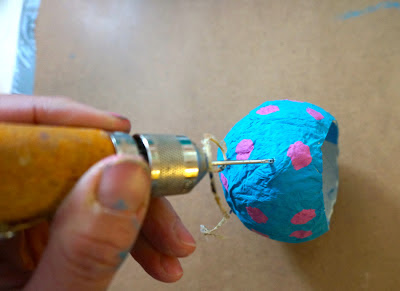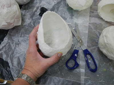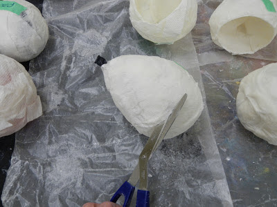 When they are dry cut a hole in each egg starting where you can see the balloon.