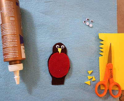 Glue on the red breast, 2 googly eyes, and a small beak cut out of the yellow craft foam.