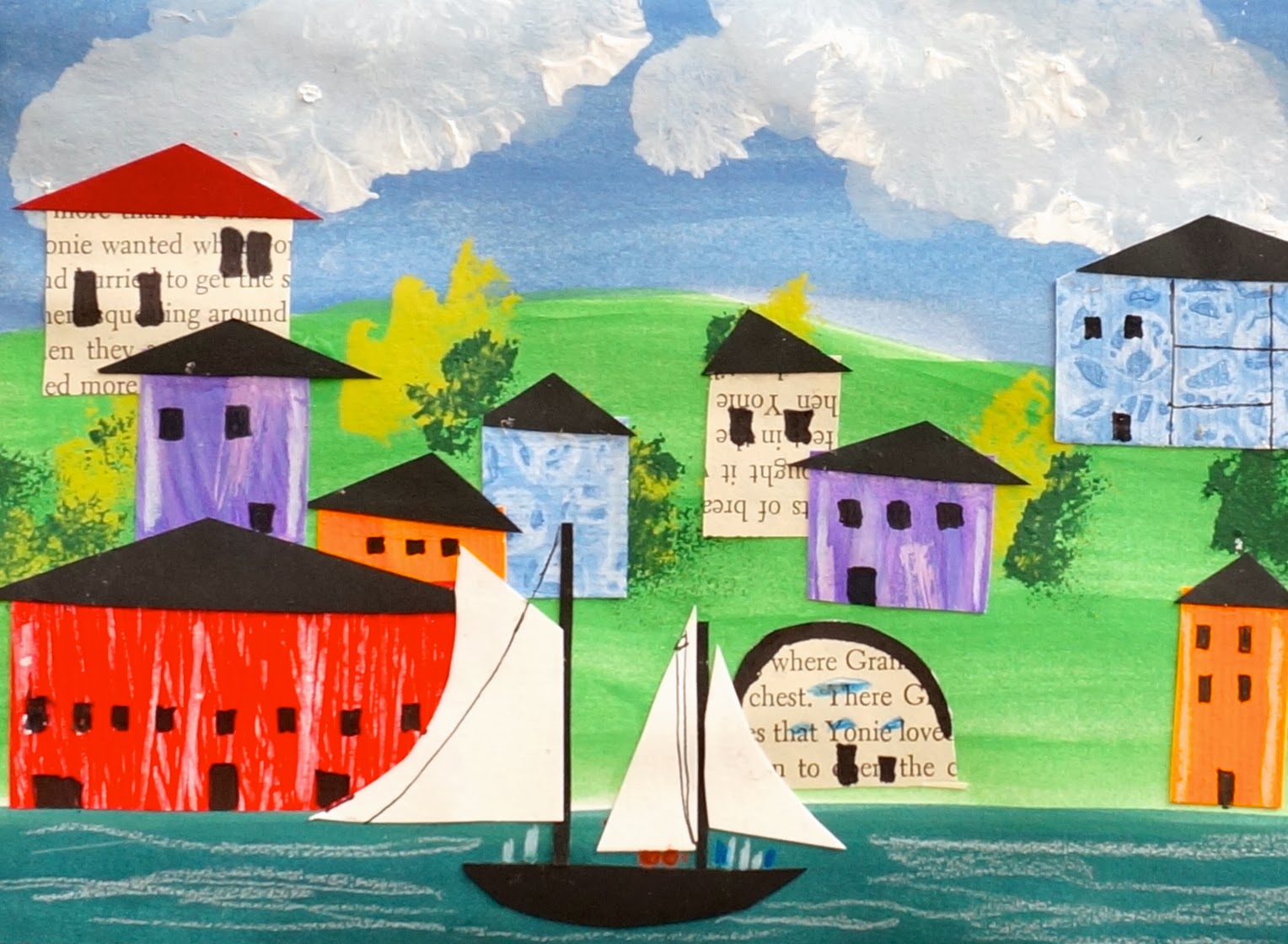 Using sharpie and white pencil crayon add windows to the buildings, details, waves to the ocean, masts to the boats, etc.