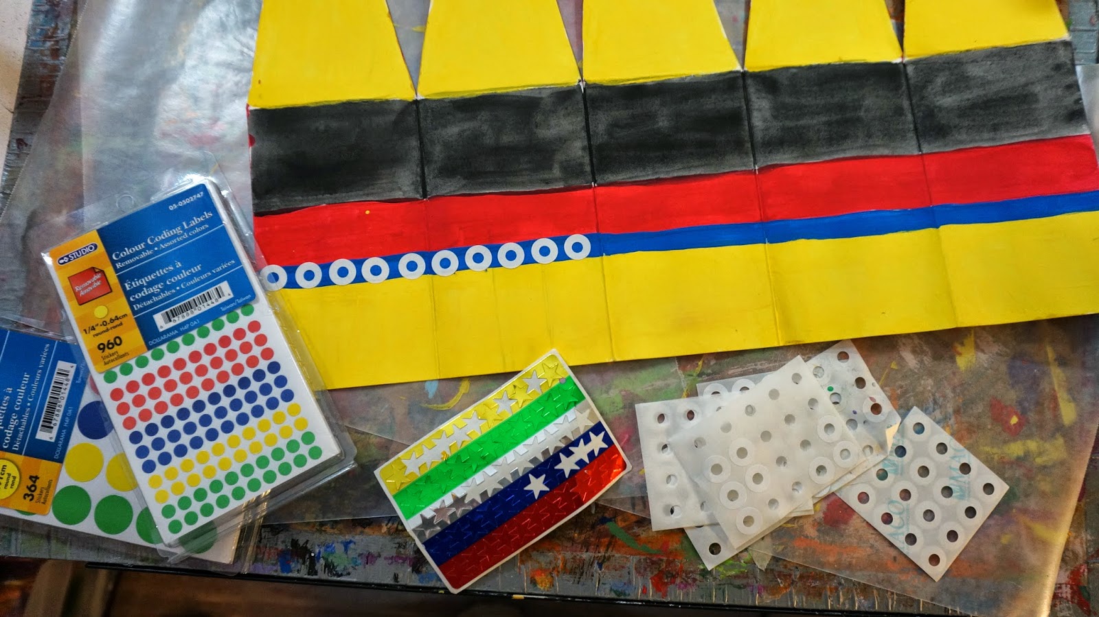 When the stripes have dried turn over and paint the inside of the tent. I did horizontal stripes. Yellow for the sawdust stage, blue and red bleachers, black for the crowd (you could add faces in the crowd here) and yellow at the top.