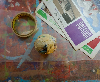Take a half piece of newspaper and squish into a ball, about the size of your palm, and tape.