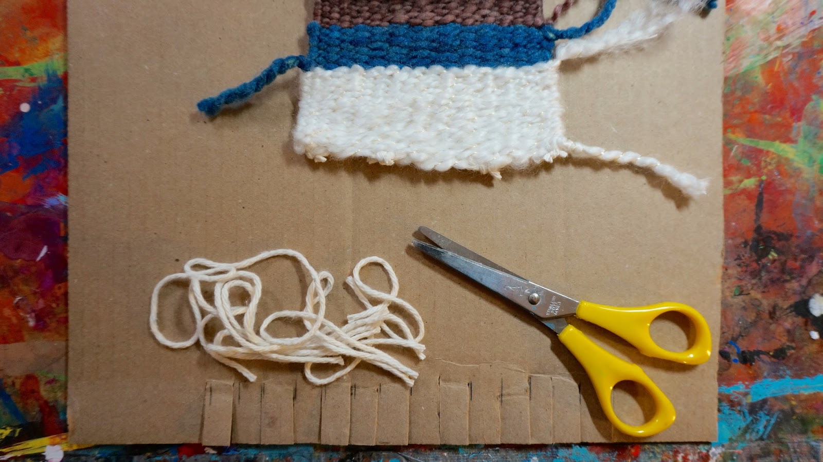 When the weaving is done it's time to take it off the cardboard loom. I do one end at a time.
