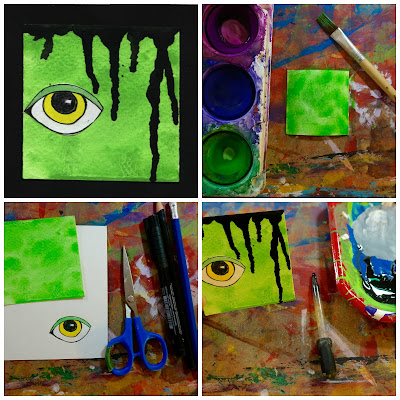 2) Draw a large eye on some white paper.  Colour it in or paint it.  Outline with sharpie or black pencil crayon.  Cut it out and glue to the green square off to one side.