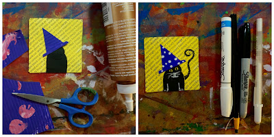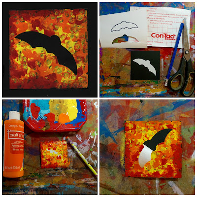 1) Cut a square of black paper 3"x3".  Cut a bat shape out of contact paper, peel and stick on the black paper.