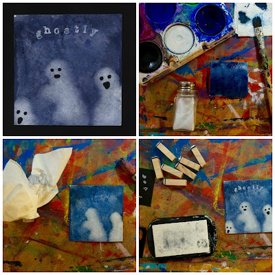 2) When the square has dried brush off the salt.  Dip a paintbrush in plain water. Paint the water where you want a ghost to be and then blot with a tissue.