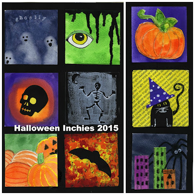 1)  On my computer I made a page of text of spooky words.  I printed it out and then traced around my inchie square on top of it.  I went for a diagonal.  Cut out and glue to your inchie square.