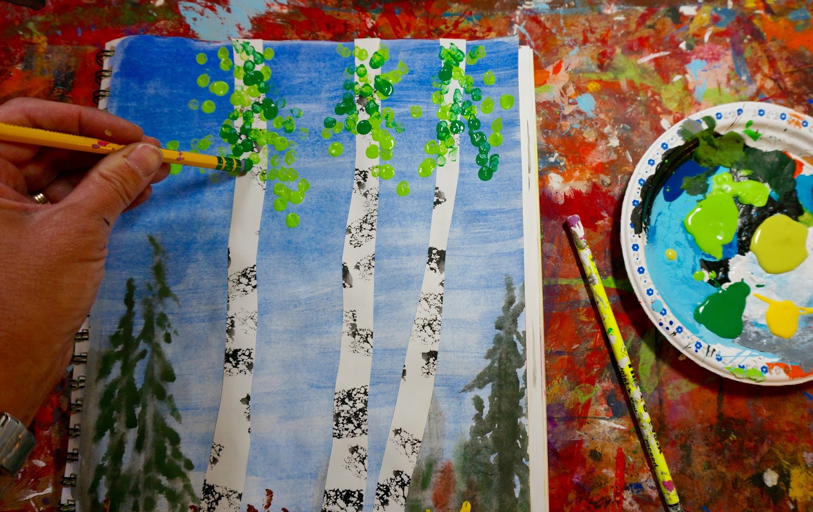 This is from another project but shows how we stamped leaves onto our aspen trees. For fall we used autumn colours. I have a set of unsharpened pencils that I use for this.