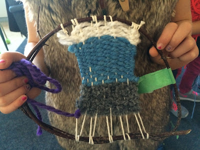 It was amazing how the process of weaving a textile feeds into the weaving of reflection or memories which then will result in a story.  As each child changed to a new colour both myself and their teacher would ask them "What does this colour represent in your chosen season?".  The answers were very expressive, "The yellow lights on my Christmas tree." or "The red watermelon of summer".  Now that their weavings are done they are working on their writing projects.