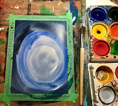 I also add some pencil crayon, layering on some different shades of blue. I am doing this lightly just to add some depth to the background.