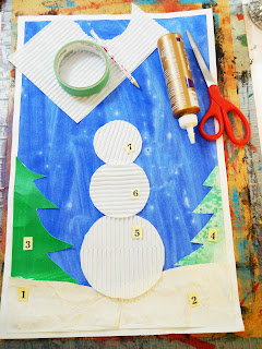 The first 2 days you add the snow.  I cut 2 snowbanks out of textured paper, (paper with white streamer glued to it).  You can add some glitter to make your snow sparkle.   For days 3 and 4 add the trees from painted paper.