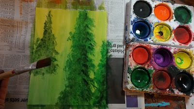Add some green to your yellow, mixing a bright lime green and paint in the rest. You'll notice the green is brushed on vertically at random heights. This adds to the illusion of the forest.
