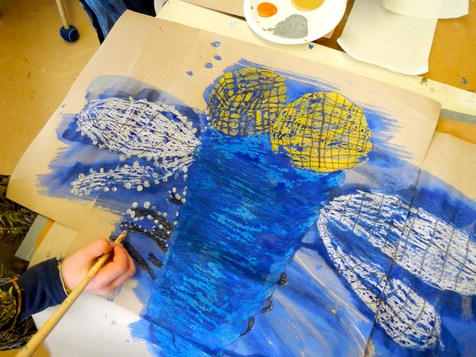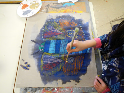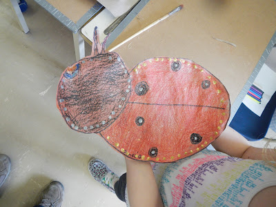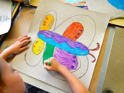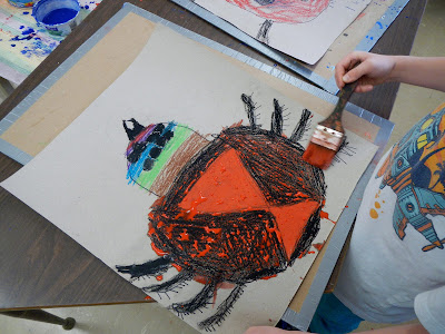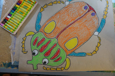 Using oil pastels colour in your bug.  Use bright colours and allow some of the paper to show thru the pastel.