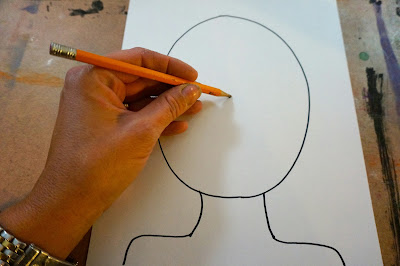 We add the neck and shoulders.  I point out that the shoulders go straight out or angle down a little.  We don't want them shaped like hills,  makes it look like we are hunching up our shoulders.