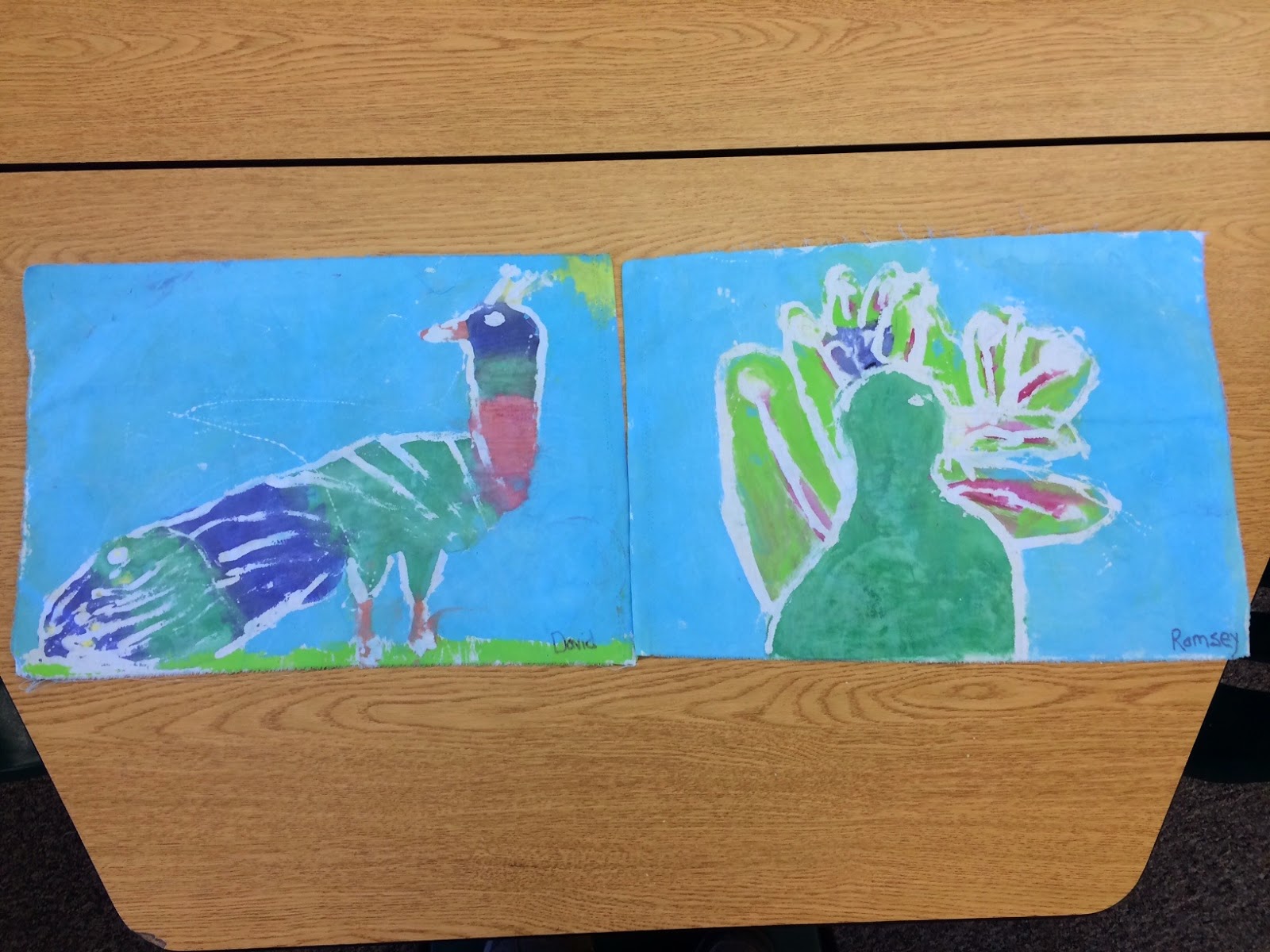 I recently did these peacock batiks with Grade 3. It ties into social studies where they are learning about India. The peacock is the national bird of India.