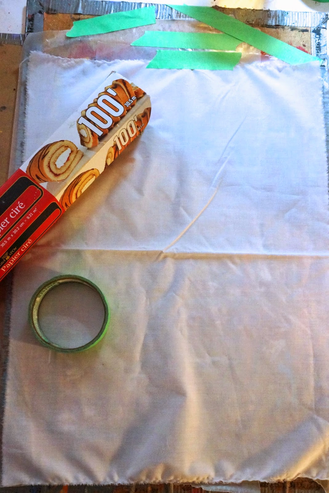 Lay down some wax paper onto your work surface. Put the fabric on top of the wax paper.