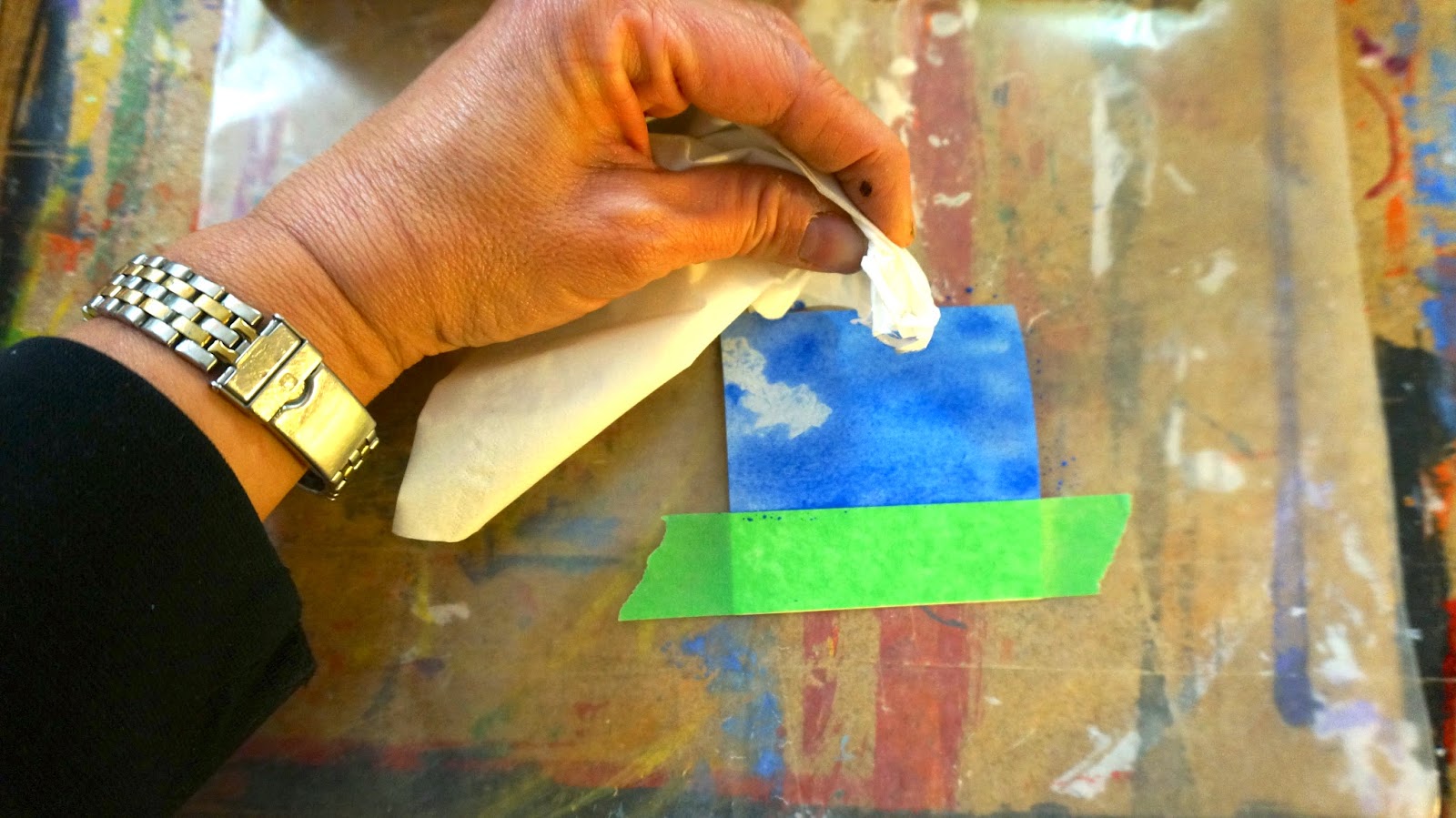 Disregard the tape on this square. Paint a square blue and while the paint is still wet lift off some clouds with a kleenex.